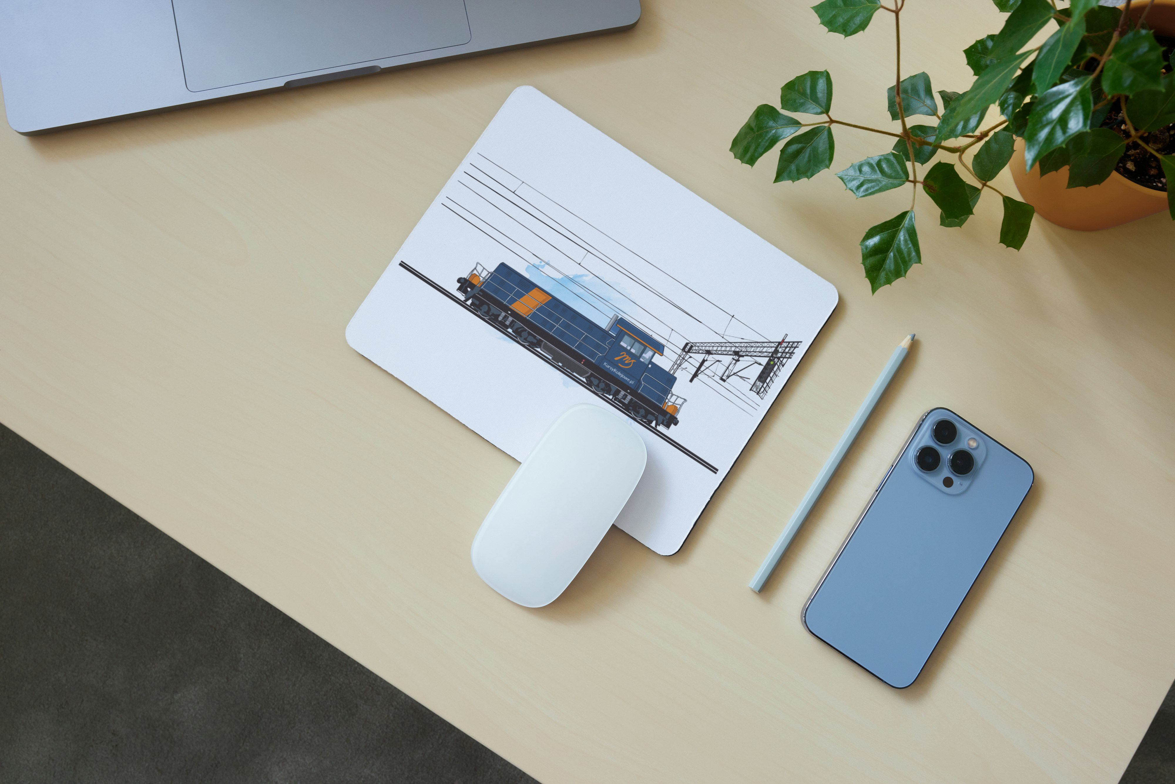 Podkładka pod mysz o wymiarach ok 22x18cm i grubości ok 2mm wykonana ze spienionej gumy i poliesteru. Na podkładce wykonano nadruk metodą sublimacji lokomotywa spalinowa 6Dg. W centralnej części lokomotywy umieszczono logotyp ośrodka szkolenia maszynistów JMS.