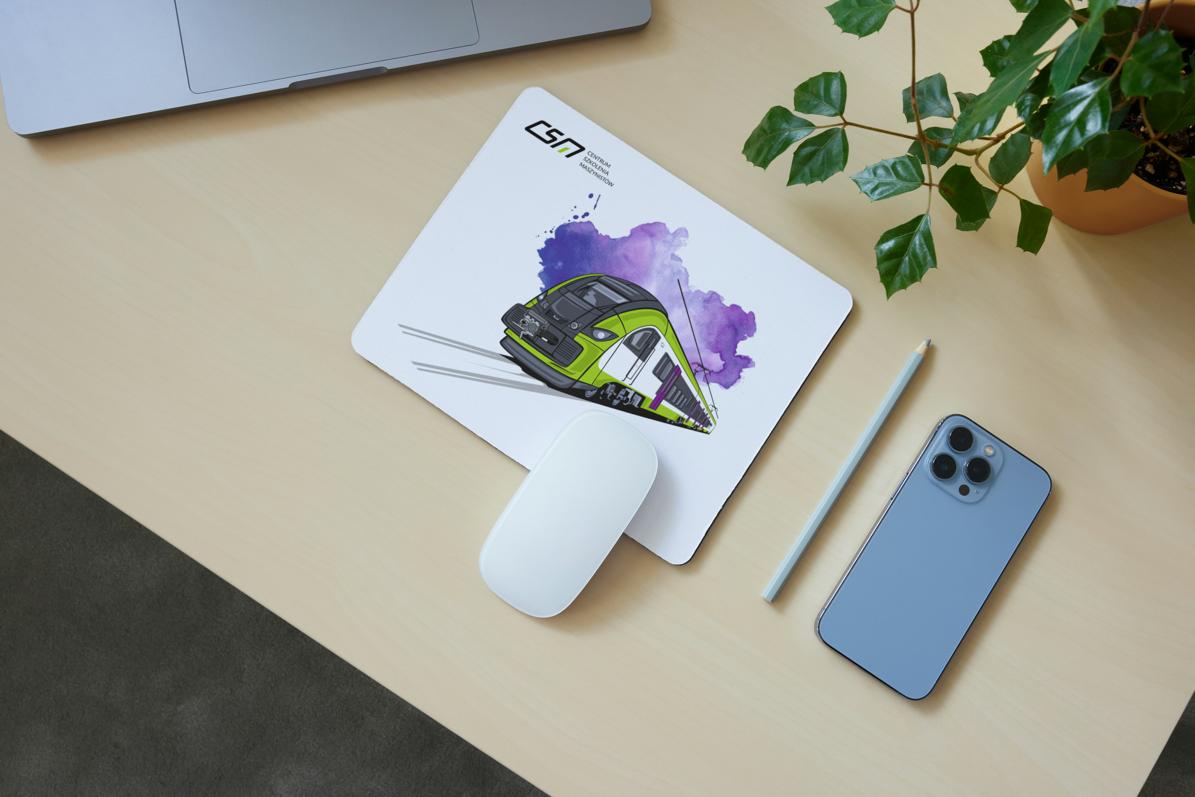 Podkładka pod mysz o wymiarach ok 22x18cm i grubości ok 2mm wykonana ze spienionej gumy i poliesteru. Na podkładce wykonano nadruk elektrycznego zespołu trakcyjnego ELF 2. W lewym górnym rogu umiejscowiono logo Centrum Szkolenia Maszynistów.