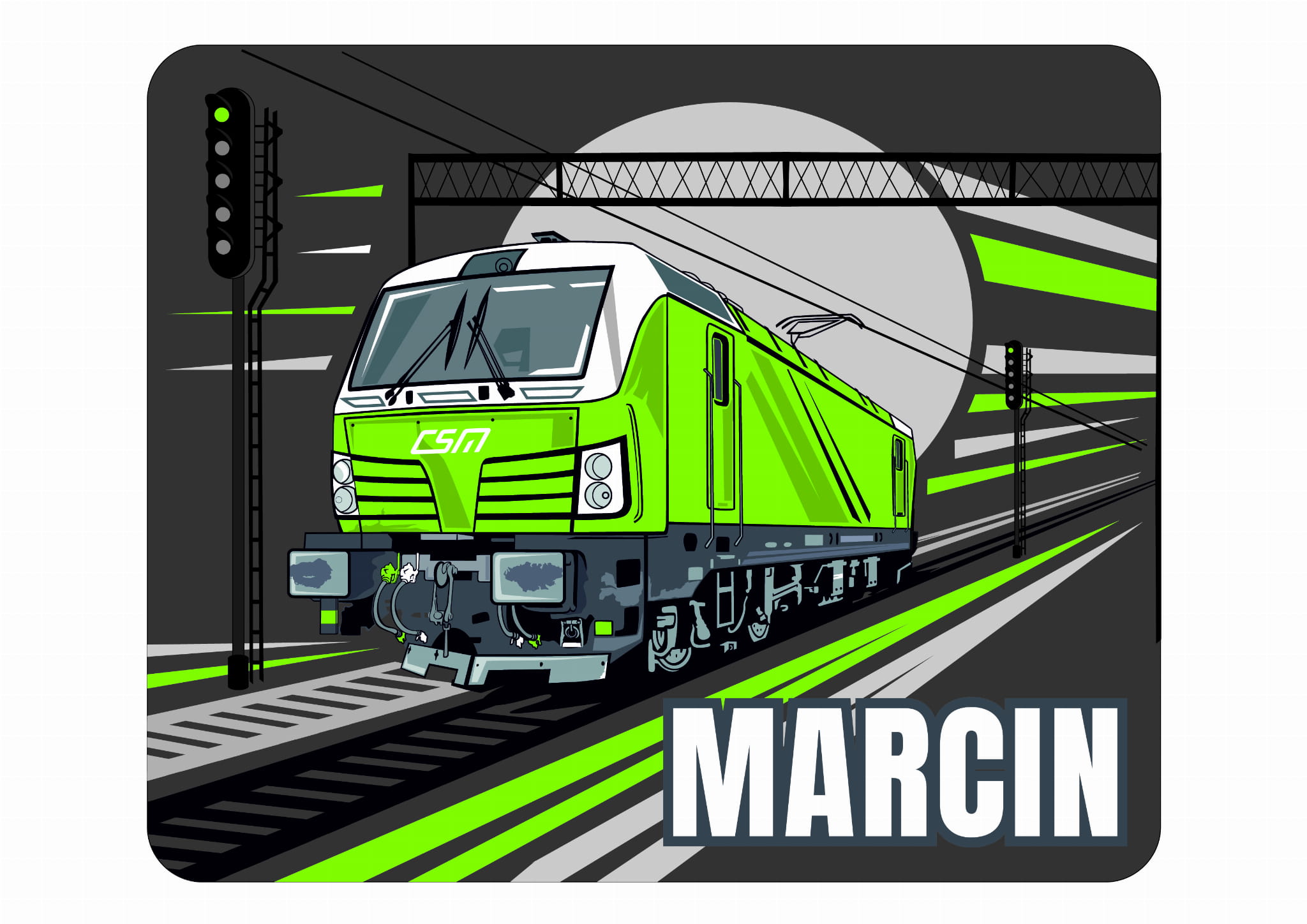 Podkładka pod mysz o wymiarach ok 22x18cm i grubości ok 2mm wykonana ze spienionej gumy i poliesteru. Na podkładce wykonano nadruk metodą sublimacji lokomotywa elektryczna Vectron. W prawym dolnym rogu możliwość spersonalizowania produktu.