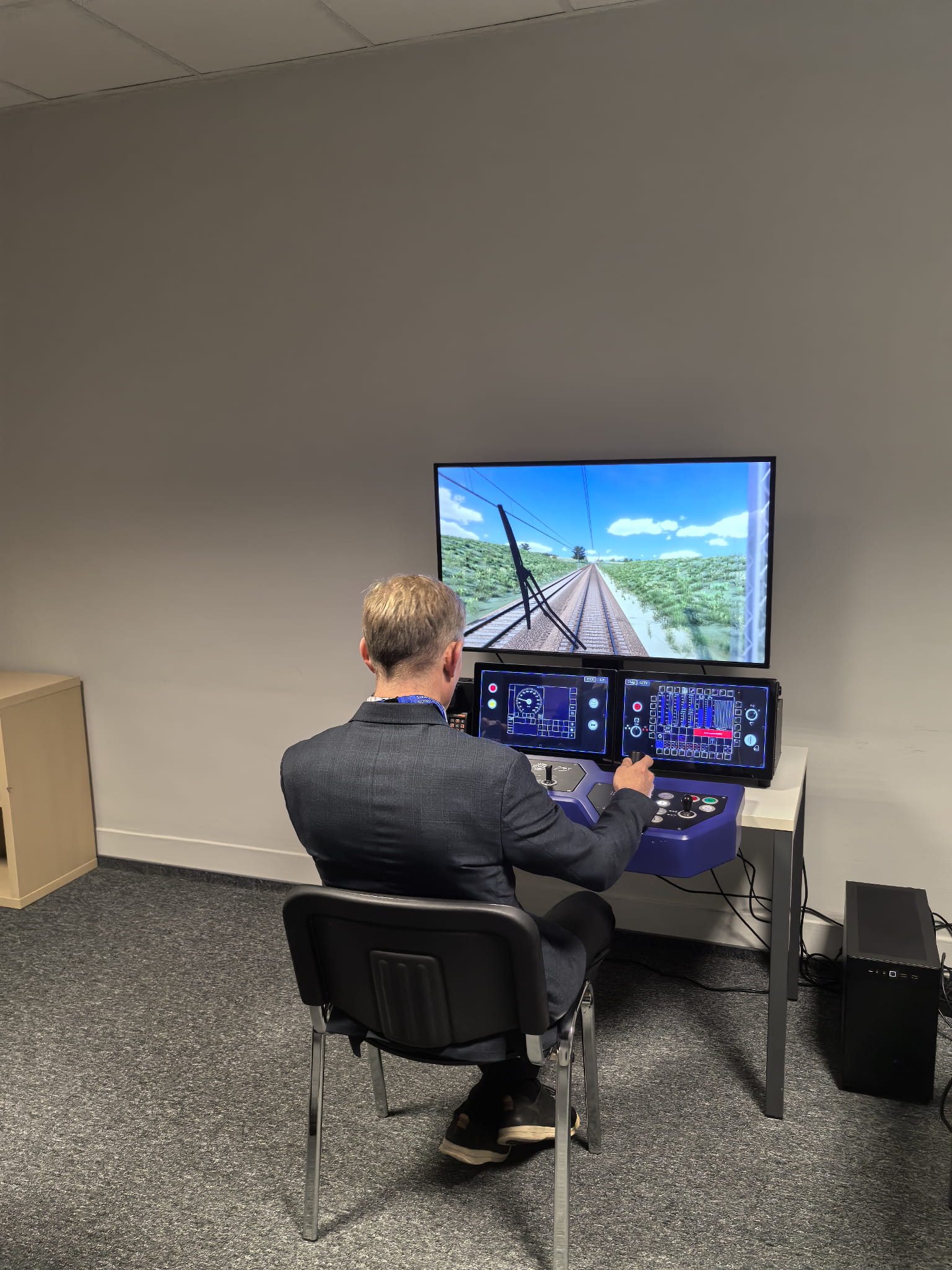 Trenażer kolejowy to profesjonalny symulator wykorzystywany przez Centrum Szkolenia Maszynistów jako narzędzie wspomagające zajęcia teoretyczne z zagadnień ruchowych, sygnalizacji kolejowych, czy prewencji i analizy wypadków kolejowych. Urządzenie umożliwia w ramach zuniwersalizowanego pulpitu możliwość prowadzenia zarówno lokomotywy elektrycznej, spalinowej, jak i jednostki pasażerskiej. Odwzorowanie ekranów jest takie samo, jak dla posiadanego symulatora kabinowego lokomotywy elektrycznej oraz dla posiadanego symulatora elektrycznego zespołu trakcyjnego, które są także na wyposażeniu CEMM UTK.